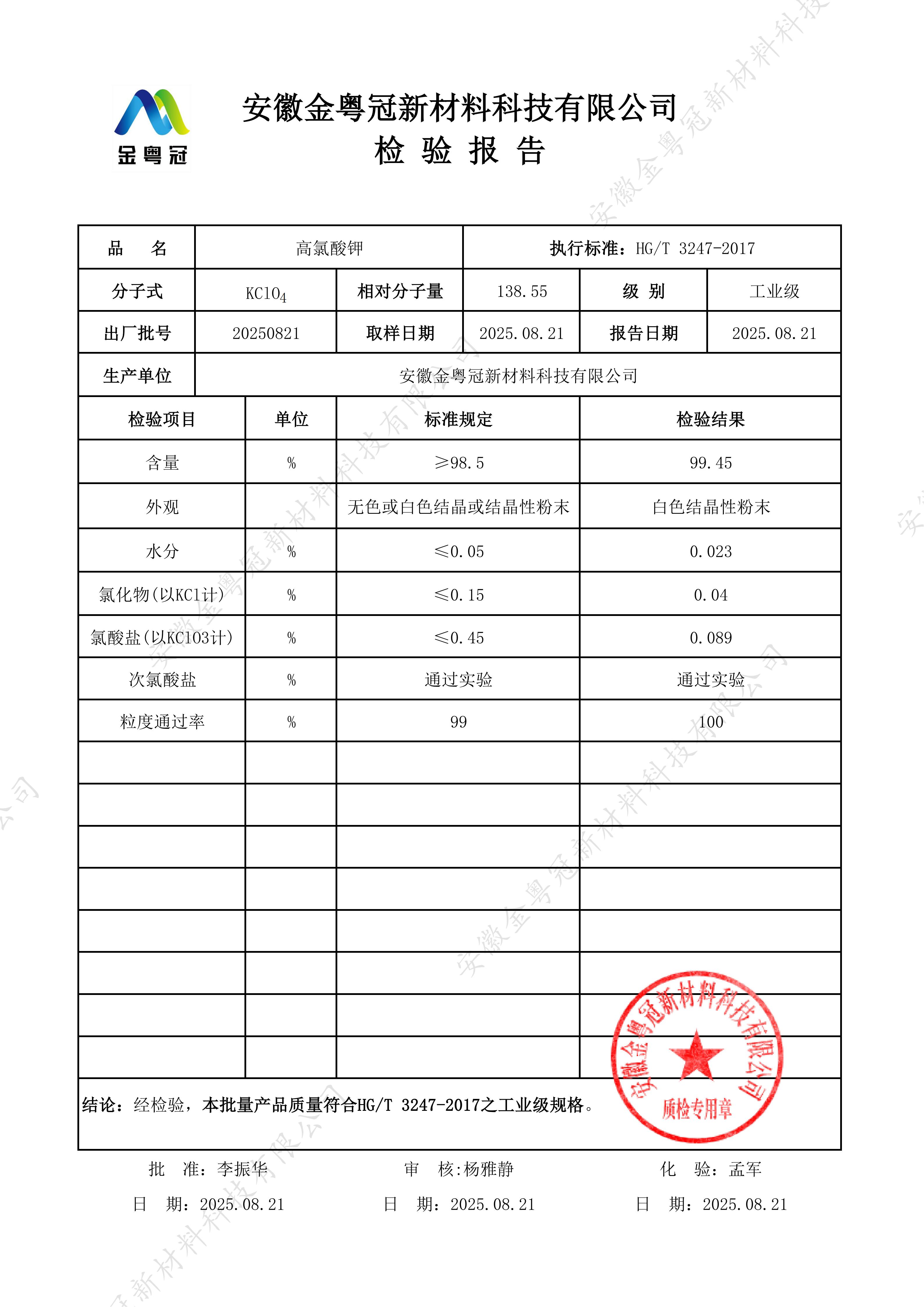 作为 “钾离子沉淀剂” 测定样品中的钾含量 —— 利用其低水溶性,向含钾离子的溶液中加入高氯酸钾,生成白色 KClO₄沉淀,通过称重法计算钾含量(适用于土壤、矿石、食品中的钾检测)。