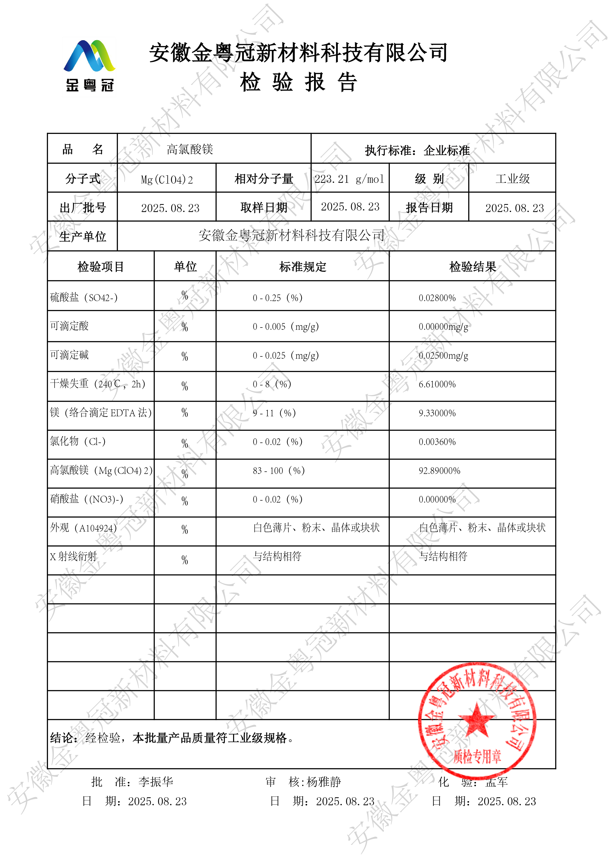 高氯酸镁(Mg(ClO₄)₂)为白色结晶性粉末,极强的吸湿性和氧化性,常用作高效干燥剂(吸水能力达60%自身重量)及固体推进剂组分。易溶于水(25℃溶解度99g/100mL),在有机溶剂中溶解度较低。 包装规格:500g/瓶 25kg/袋 级别:无水高氯酸镁,六水高氯酸镁